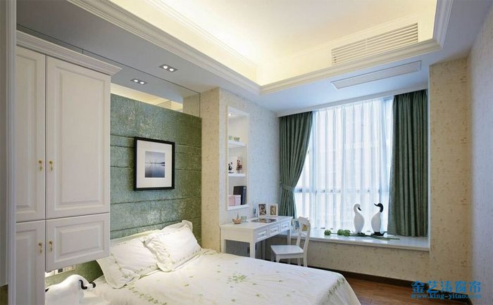 適合臥室小但有大飄窗的家庭。窗簾裝在飄窗里顯得臥室寬敞;里面頂裝,不占空間,還美觀。但如果你家里的飄窗面積小,做了則會感覺飄窗視覺效果太擁擠。